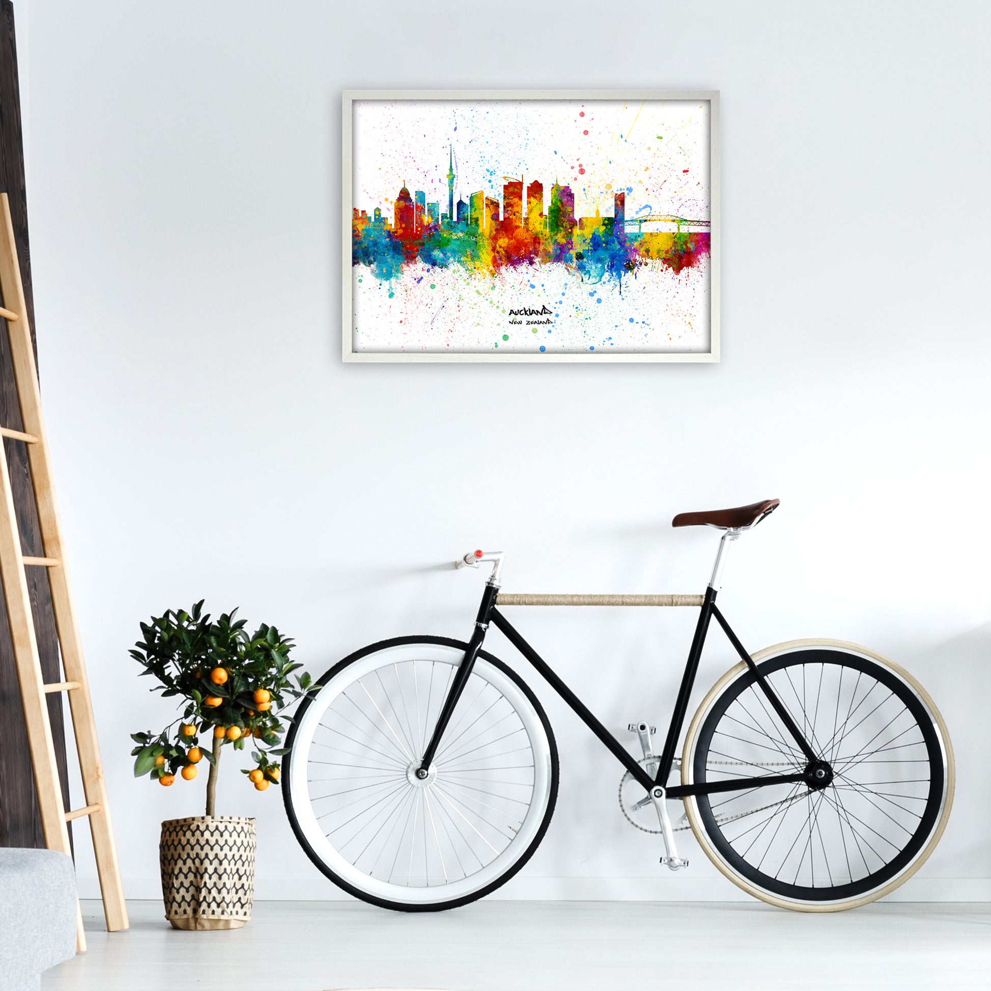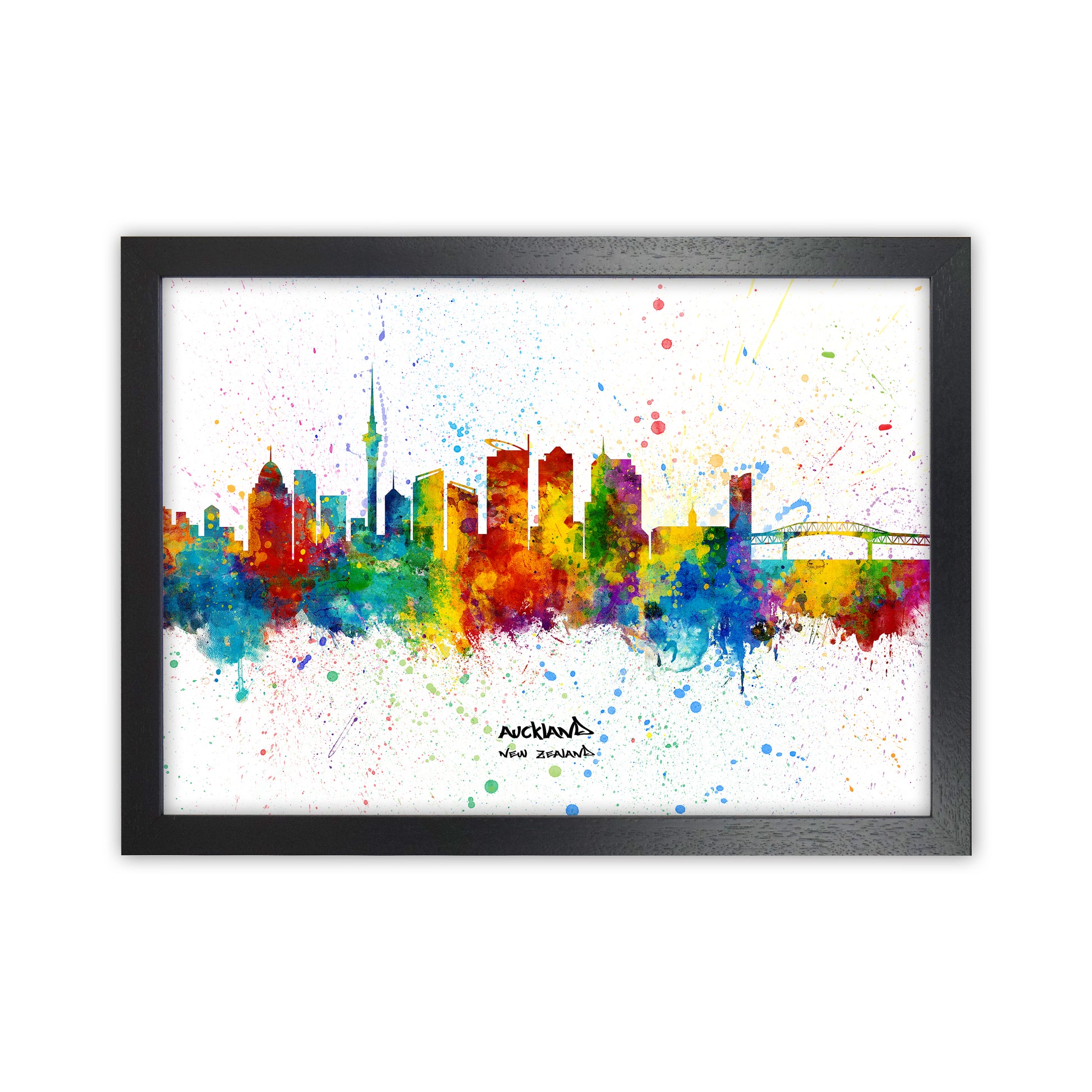 Auckland New Zealand Skyline Splash original Giclée fine art print. Available both as a framed print, print only or vibrant canvas art. Art print from an original by Michael Tompsett ©