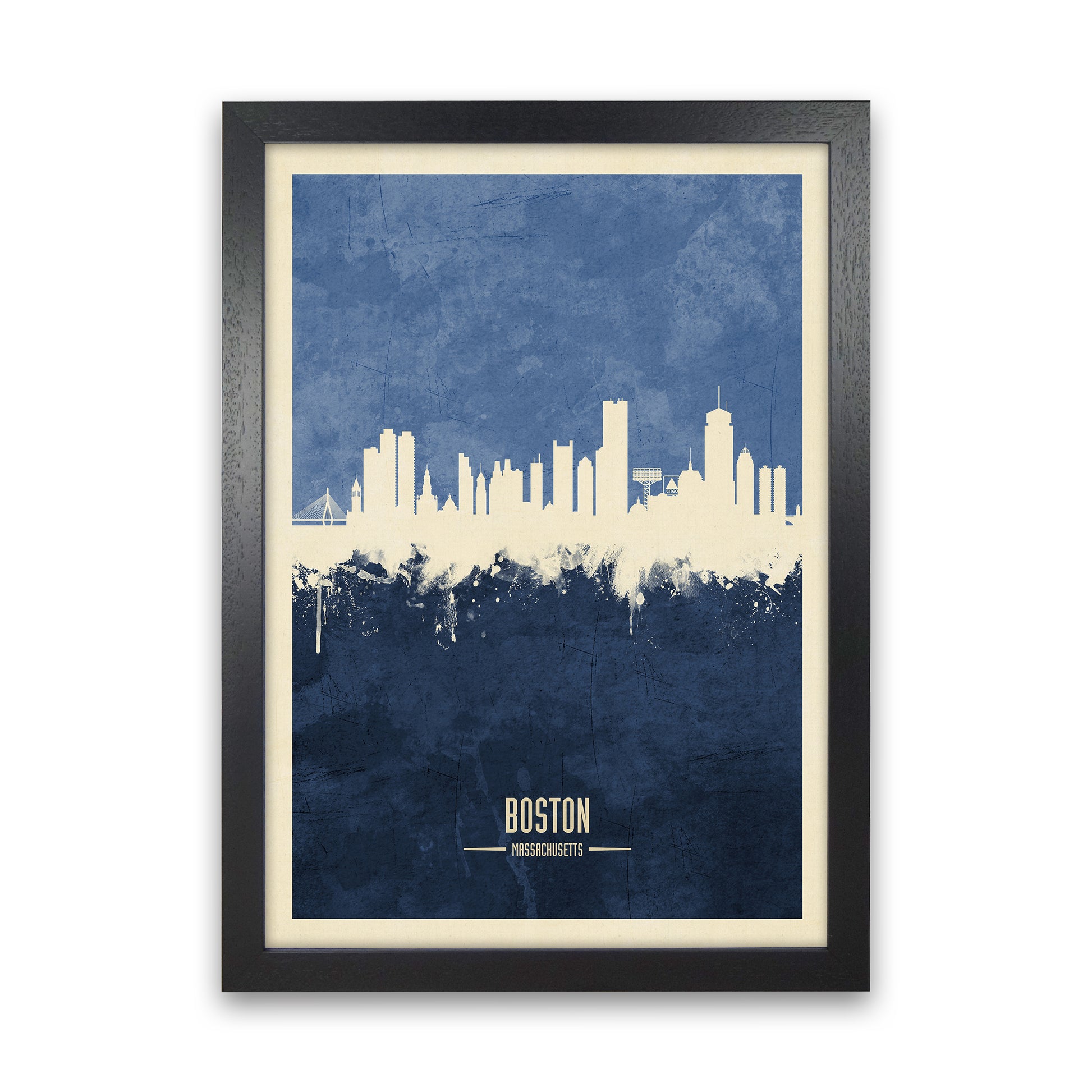 Boston Massachusetts Skyline Portrait Navy original Giclée fine art print. Available both as a framed print, print only or vibrant canvas art. Art print from an original by Michael Tompsett ©