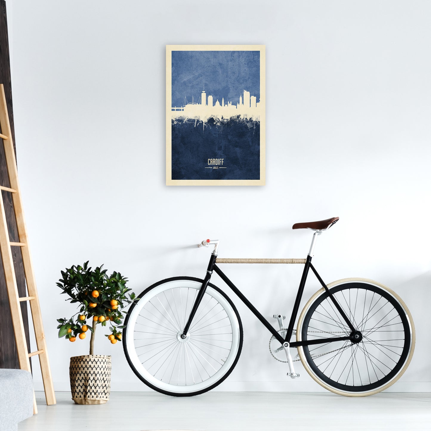 Cardiff Wales Skyline Portrait Navy original Giclée fine art print. Available both as a framed print, print only or vibrant canvas art. Art print from an original by Michael Tompsett ©
