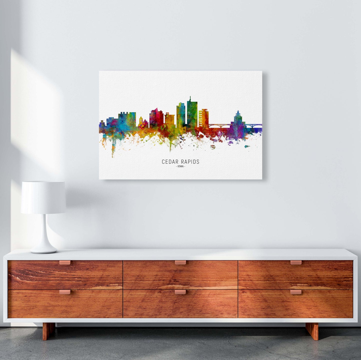 Cedar Rapids Iowa Skyline original Giclée fine art print. Available both as a framed print, print only or vibrant canvas art. Art print from an original by Michael Tompsett ©
