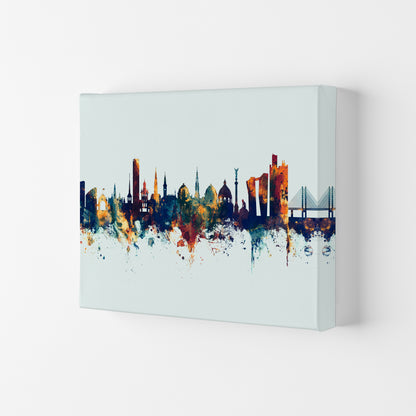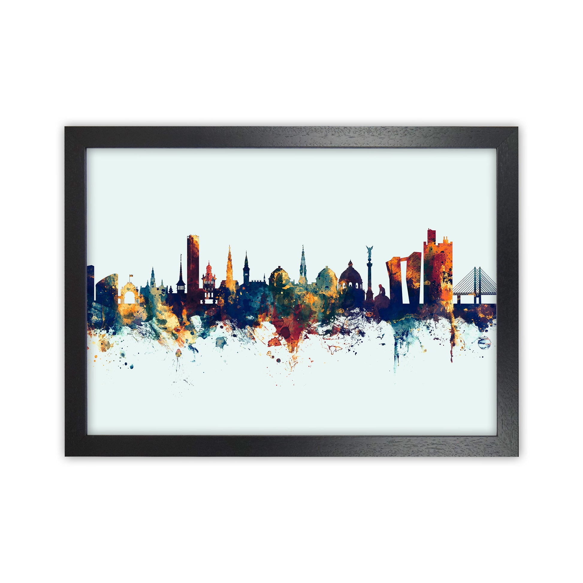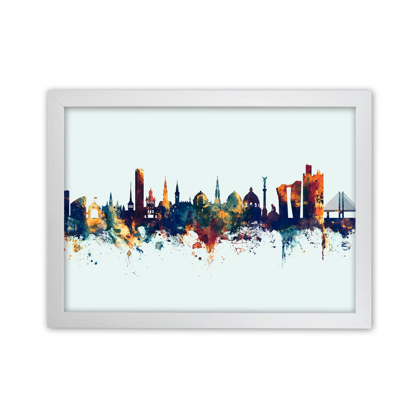 Copenhagen Denmark Skyline Blue Orange original Giclée fine art print. Available both as a framed print, print only or vibrant canvas art. Art print from an original by Michael Tompsett ©