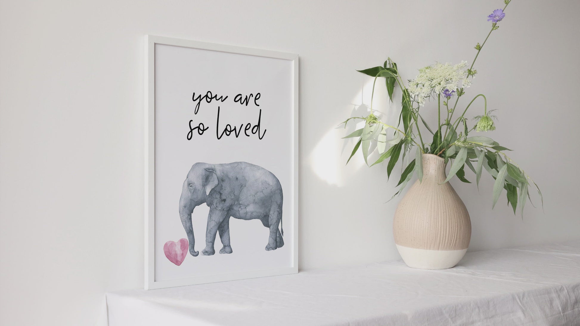 Elephant You Are So Loved original Giclée fine art print. Available both as a framed print, print only or vibrant canvas art. Art print from an original by Pixy Paper ©