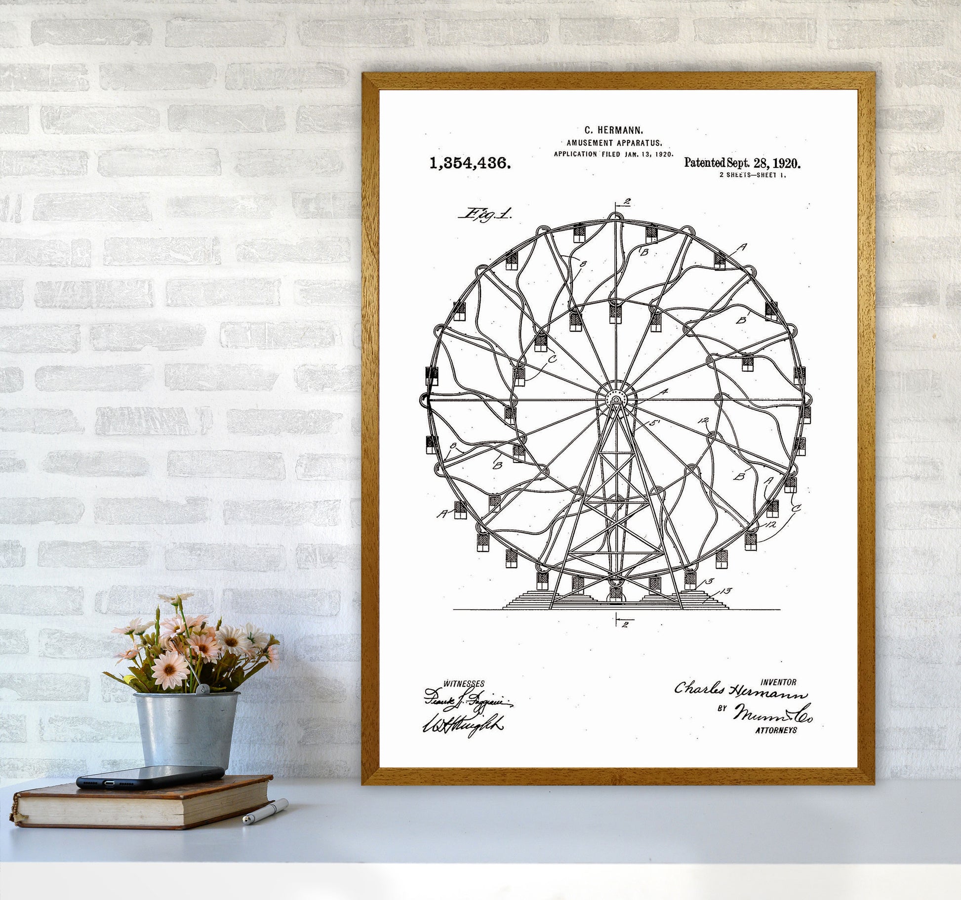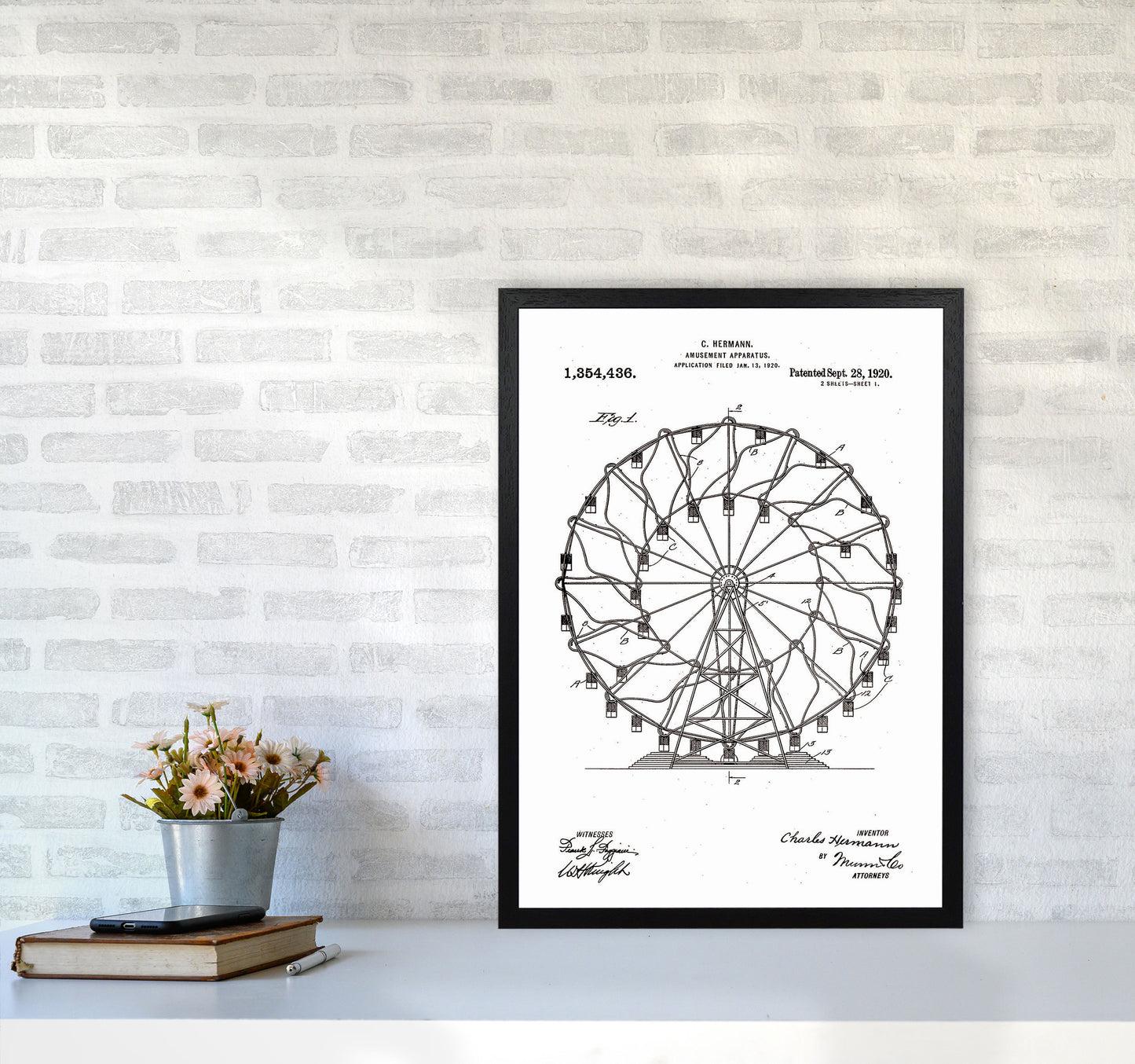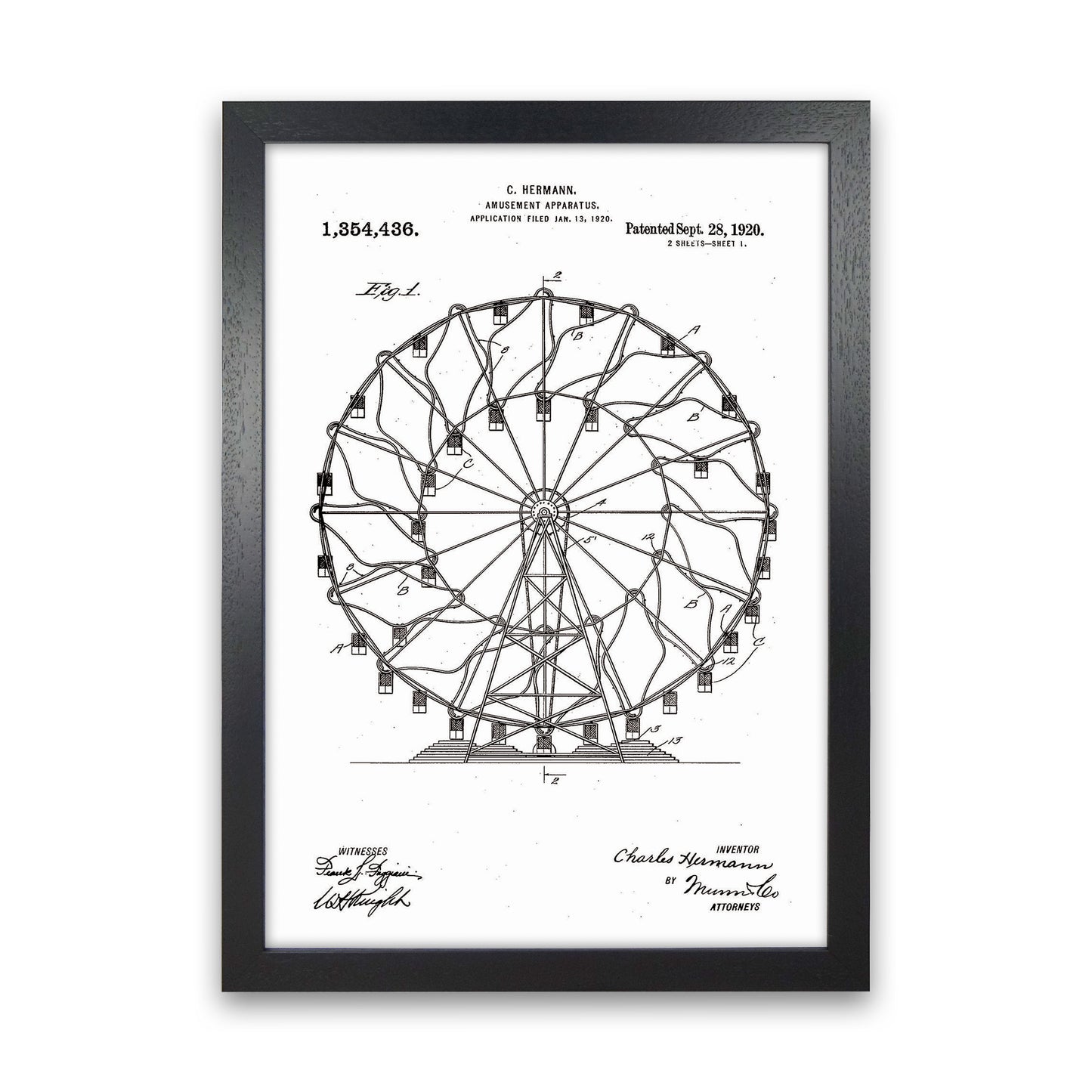 Ferris Wheel Patent original Giclée fine art print. Available both as a framed print, print only or vibrant canvas art. Art print from an original by Jason Stanley ©