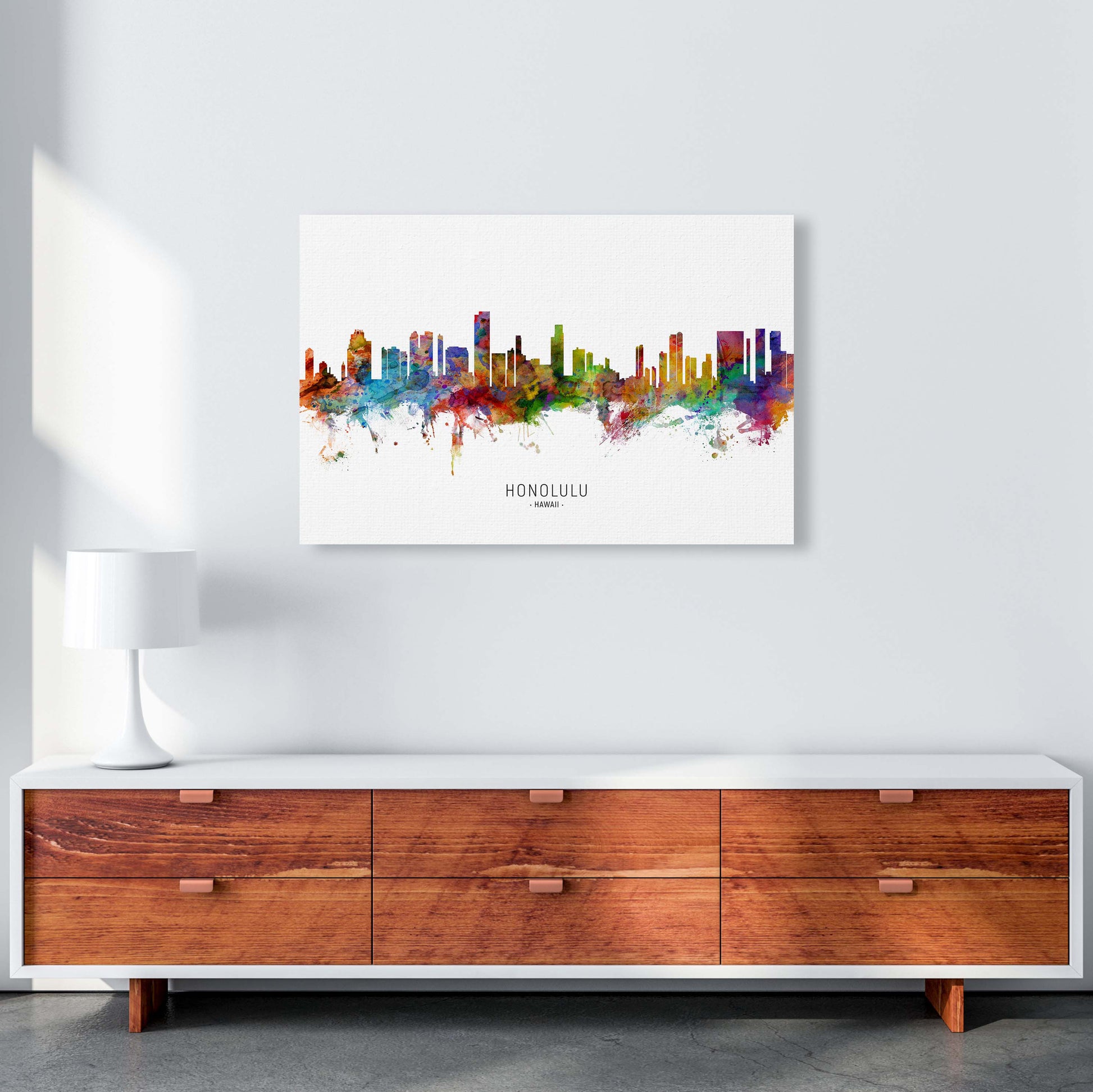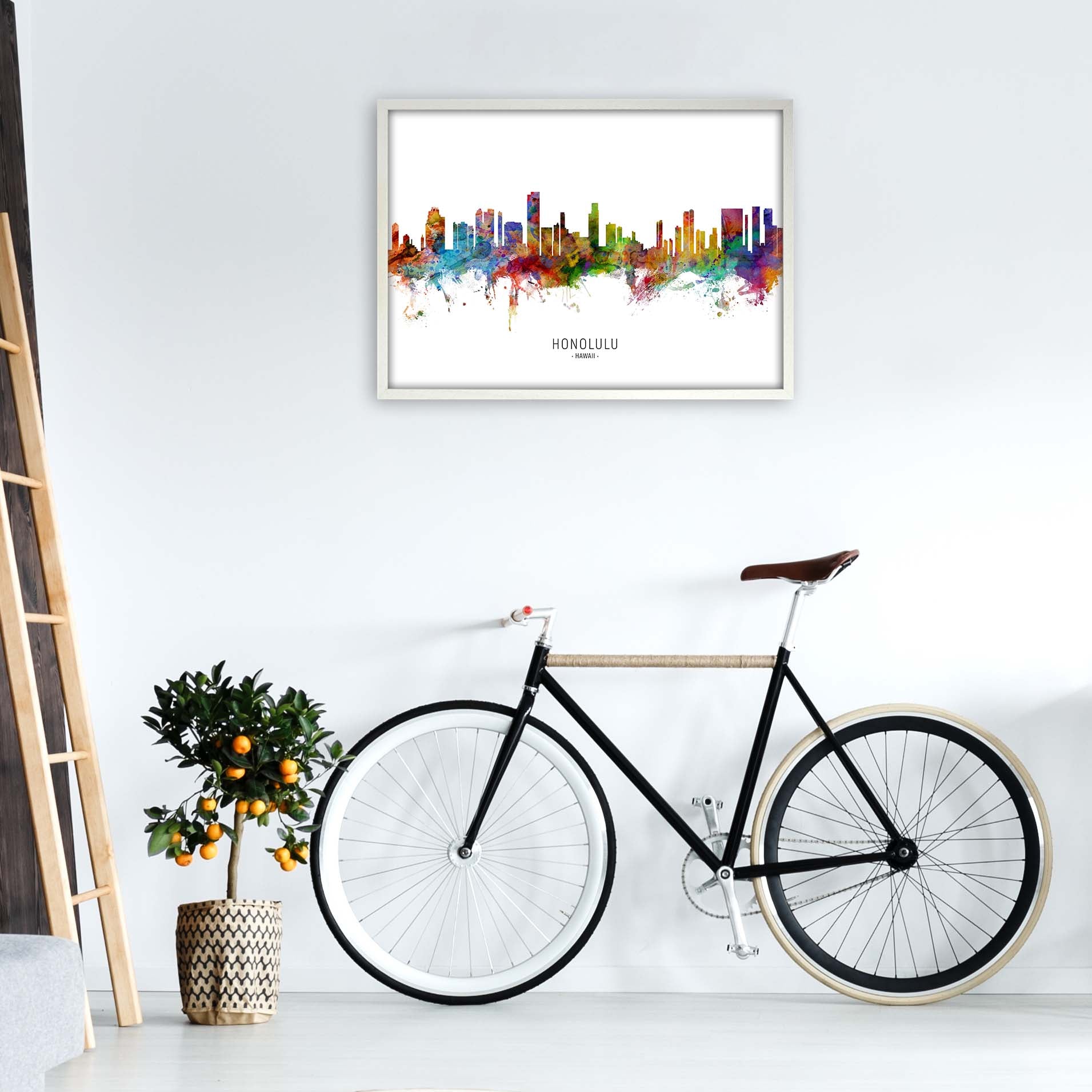Honolulu Hawaii Skyline original Giclée fine art print. Available both as a framed print, print only or vibrant canvas art. Art print from an original by Michael Tompsett ©