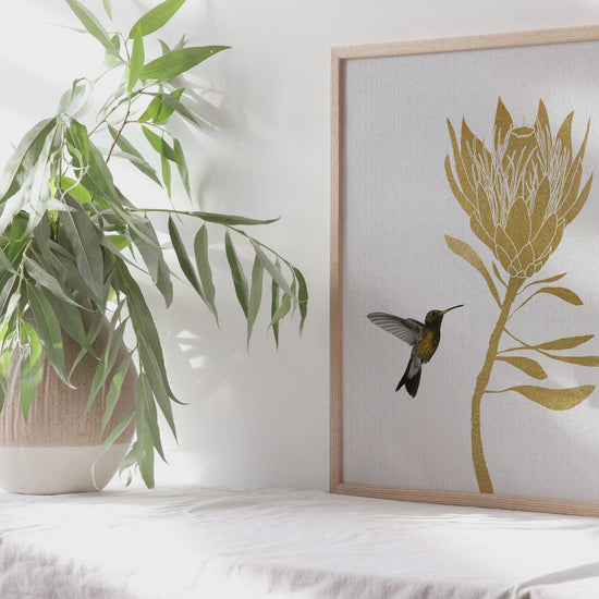 Hummingbird & Flower I original Giclée fine art print. Available both as a framed print, print only or vibrant canvas art. Art print from an original by Orara Studio ©