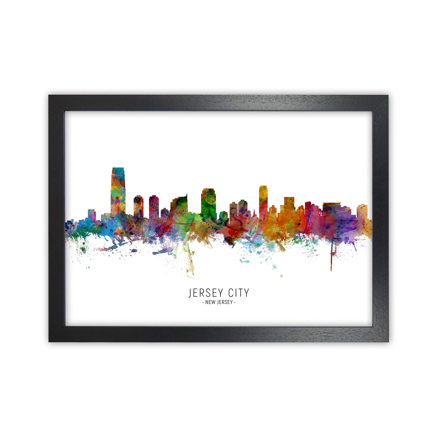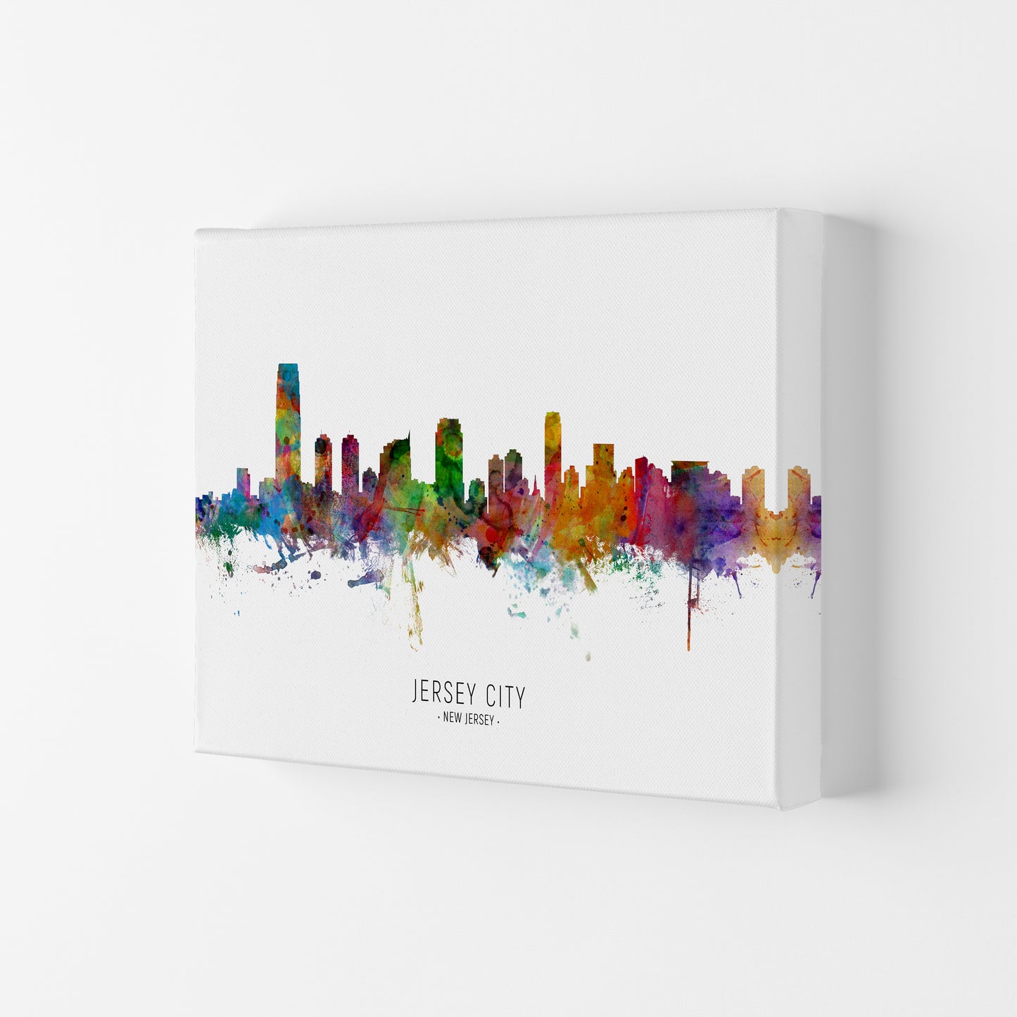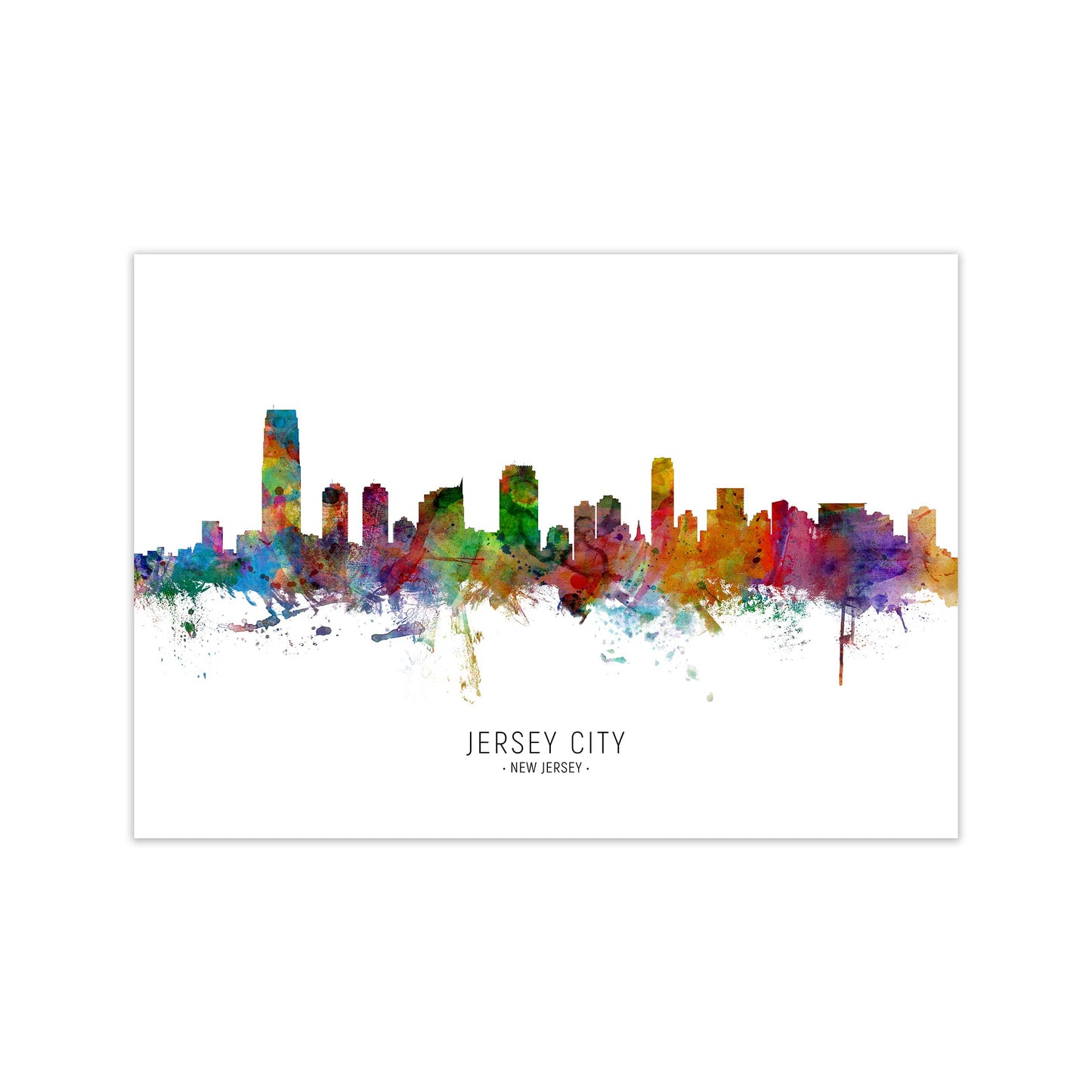 Jersey City New Jersey Skyline original Giclée fine art print. Available both as a framed print, print only or vibrant canvas art. Art print from an original by Michael Tompsett ©
