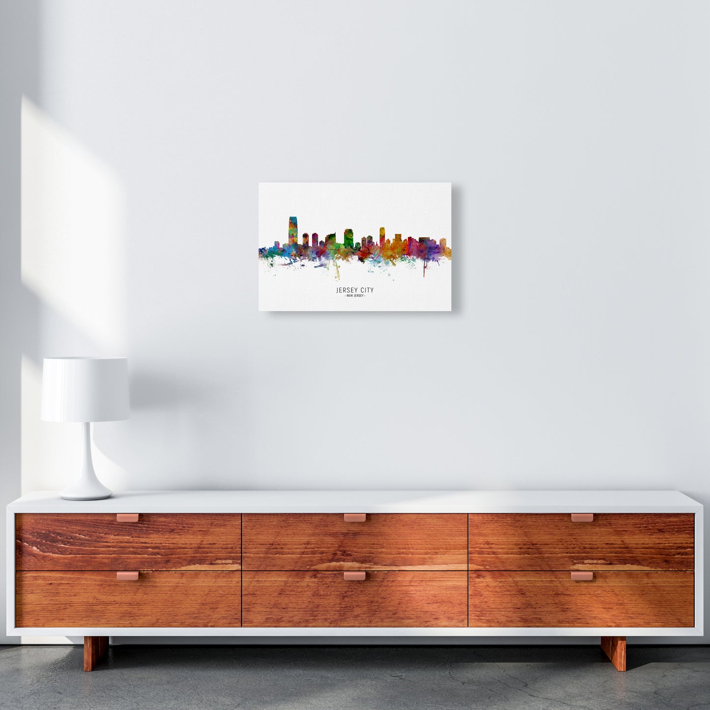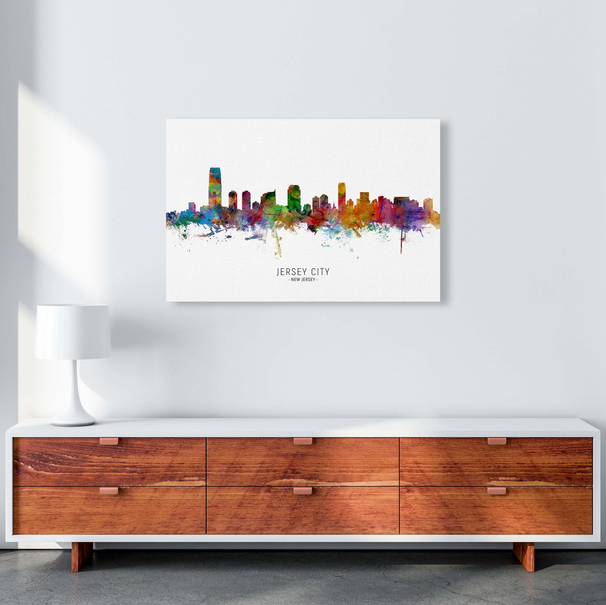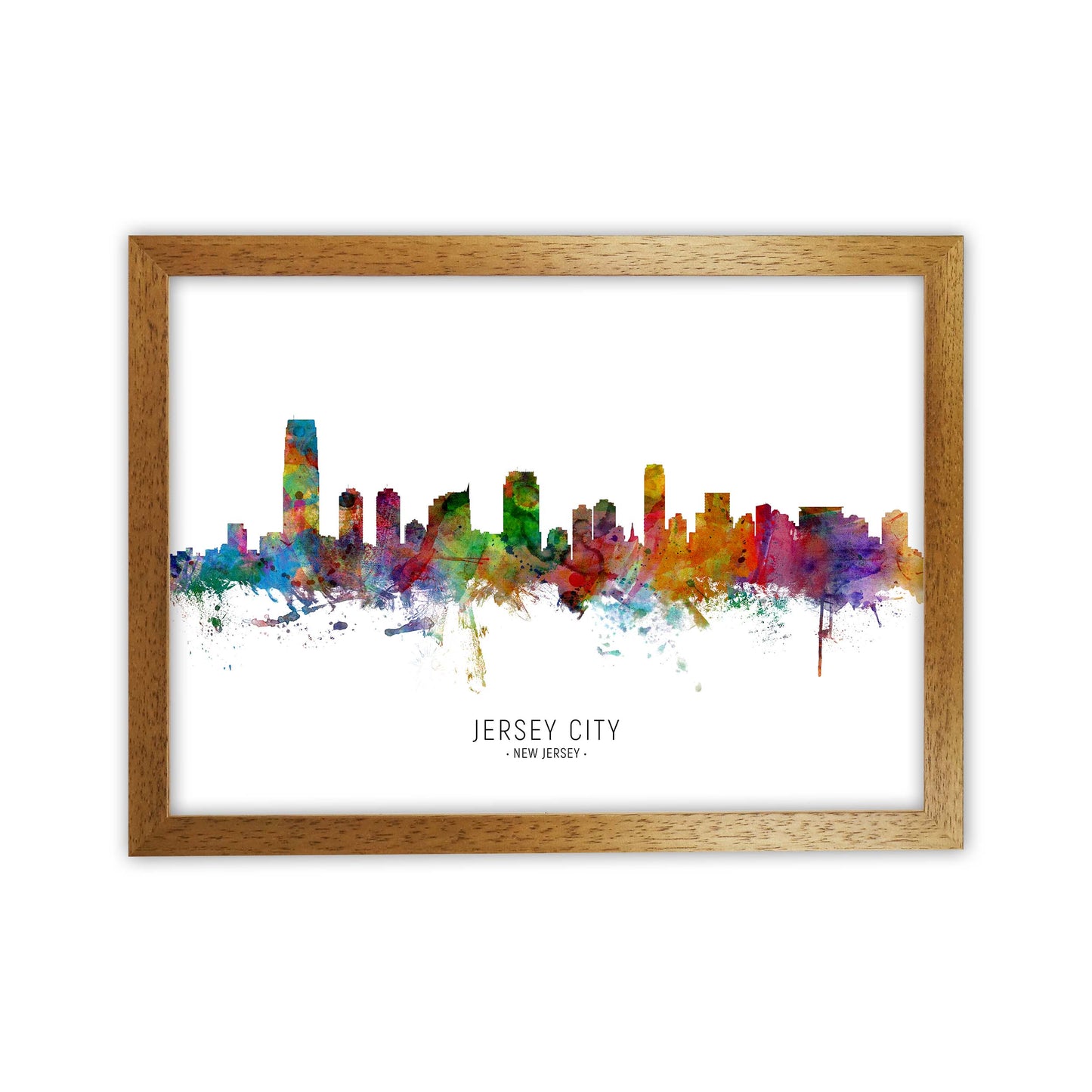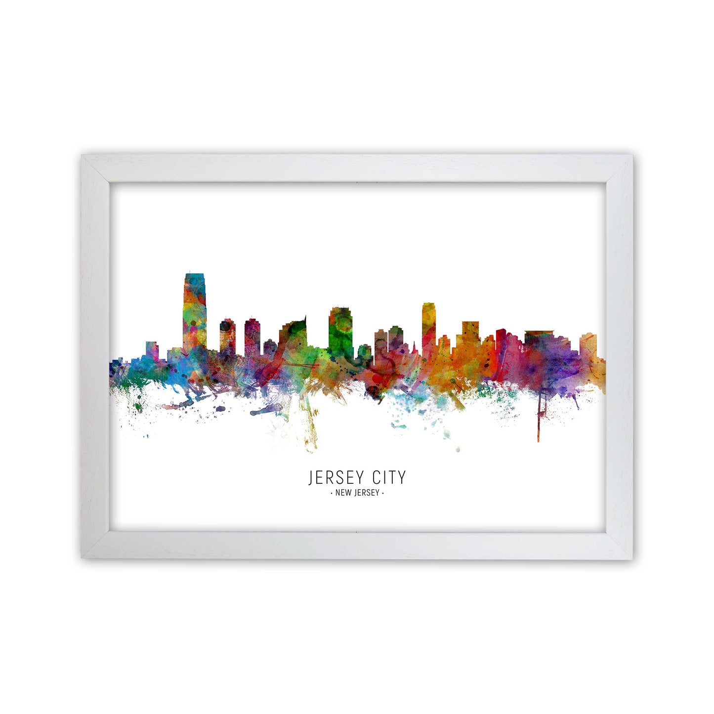 Jersey City New Jersey Skyline original Giclée fine art print. Available both as a framed print, print only or vibrant canvas art. Art print from an original by Michael Tompsett ©