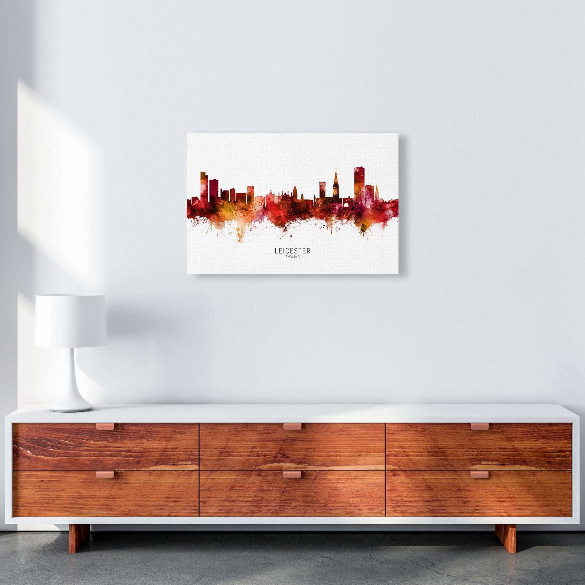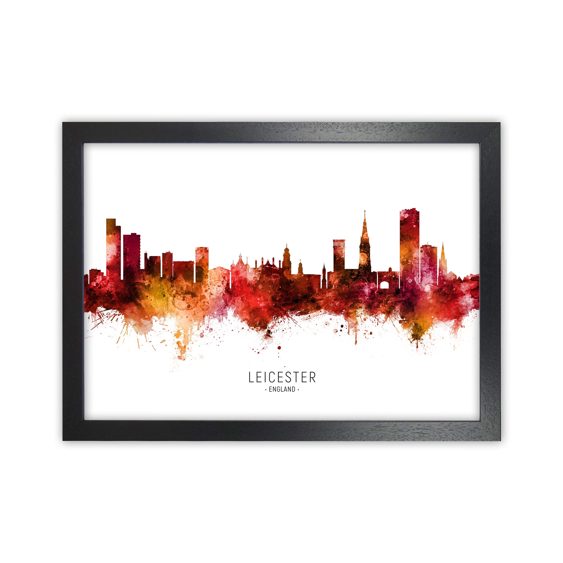 Leicester England Skyline Red City Name original Giclée fine art print. Available both as a framed print, print only or vibrant canvas art. Art print from an original by Michael Tompsett ©