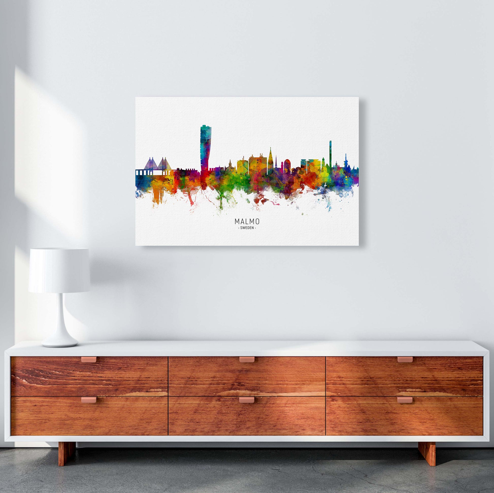 Malmo Sweden Skyline original Giclée fine art print. Available both as a framed print, print only or vibrant canvas art. Art print from an original by Michael Tompsett ©