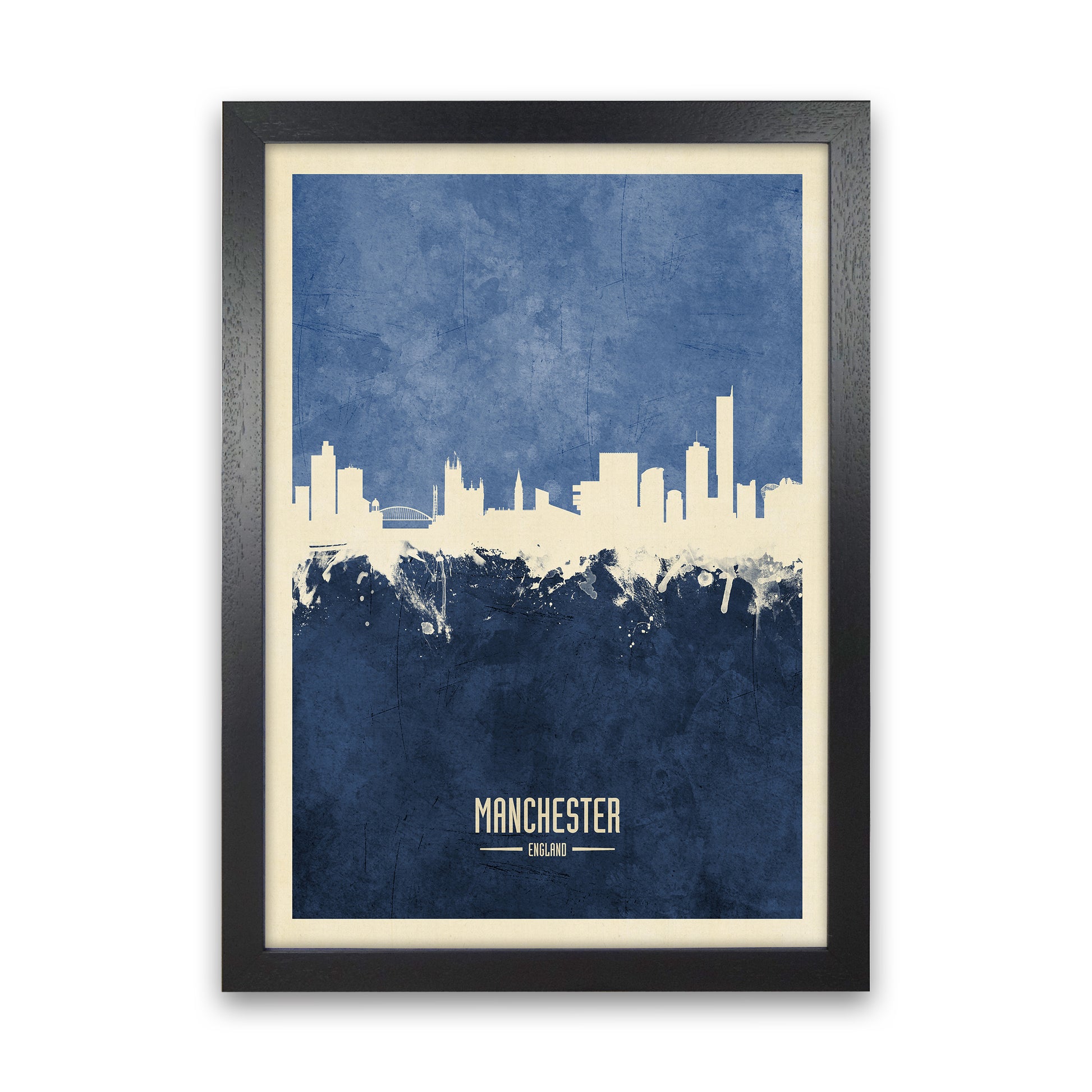 Manchester England Skyline Portrait Navy original Giclée fine art print. Available both as a framed print, print only or vibrant canvas art. Art print from an original by Michael Tompsett ©