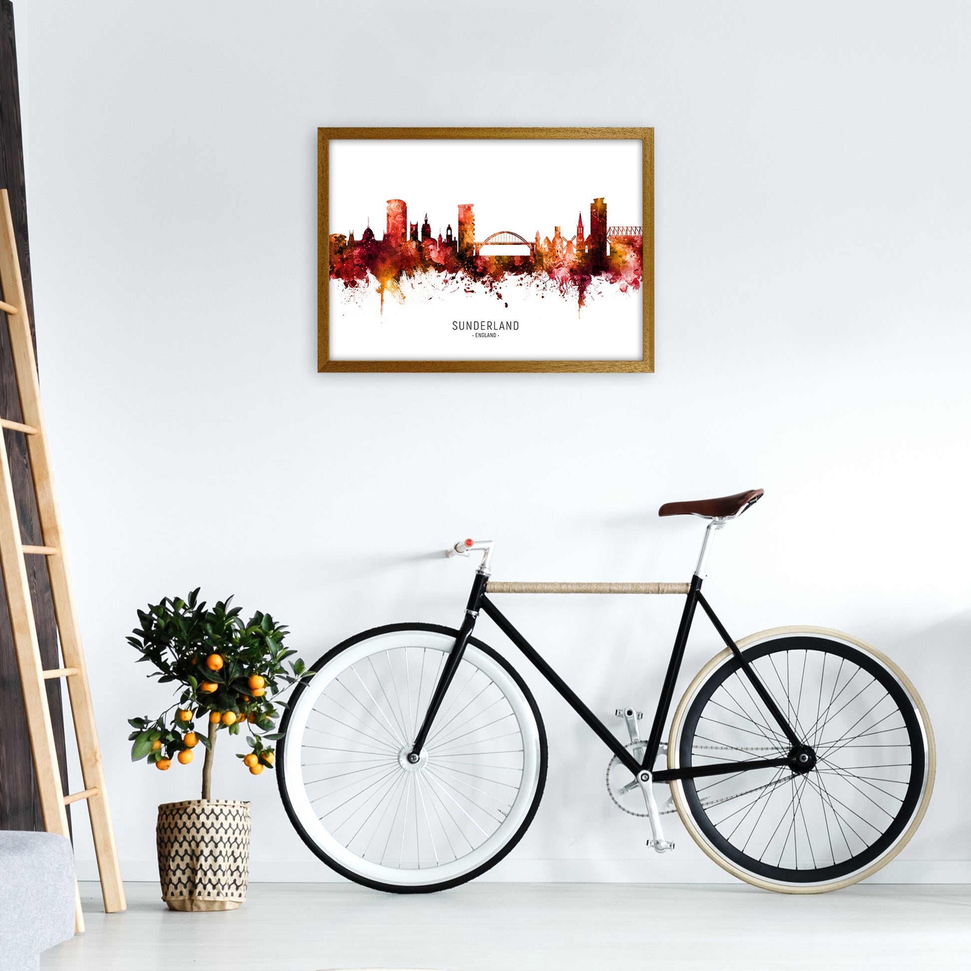Sunderland England Skyline Red City Name original Giclée fine art print. Available both as a framed print, print only or vibrant canvas art. Art print from an original by Michael Tompsett ©