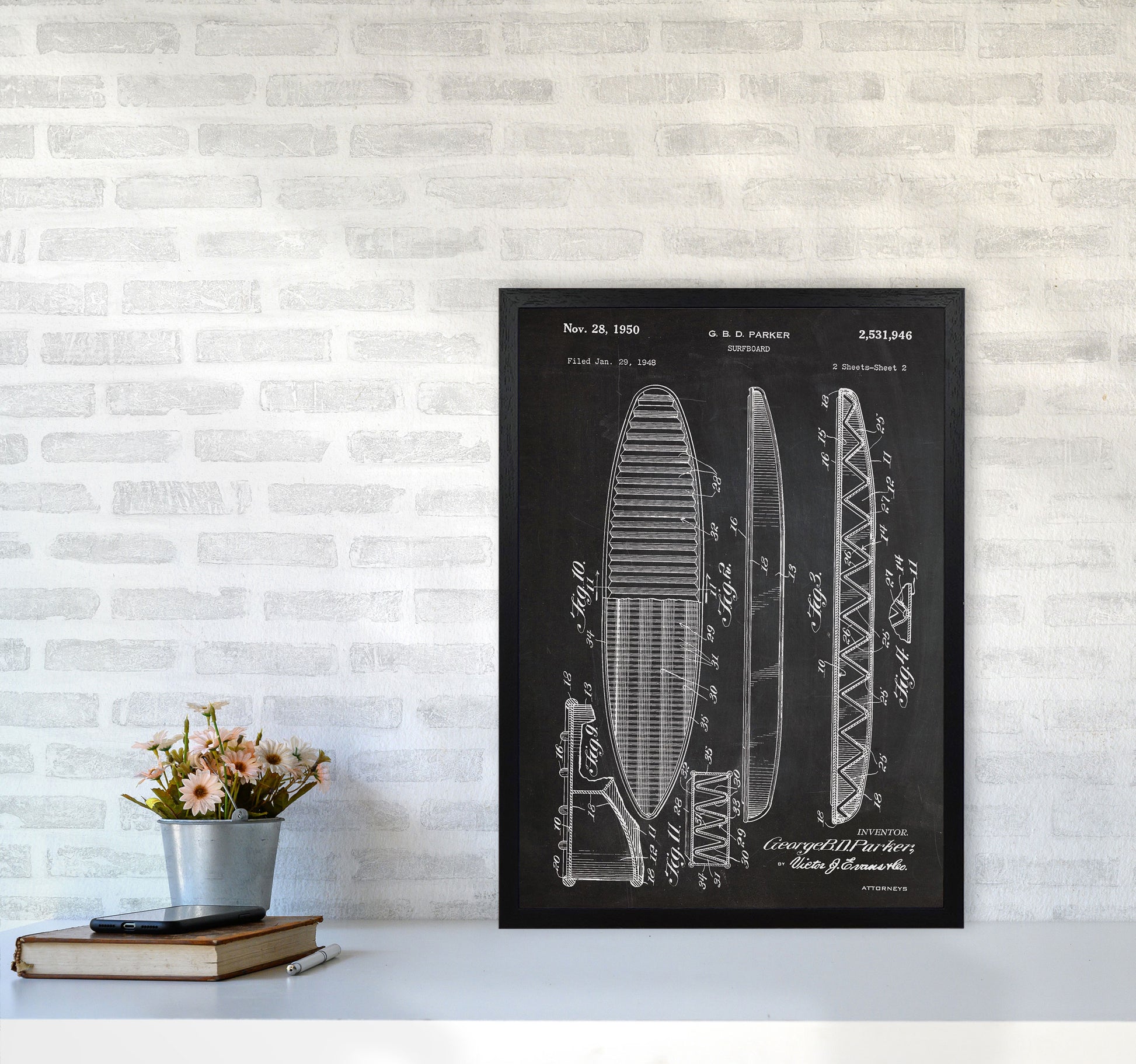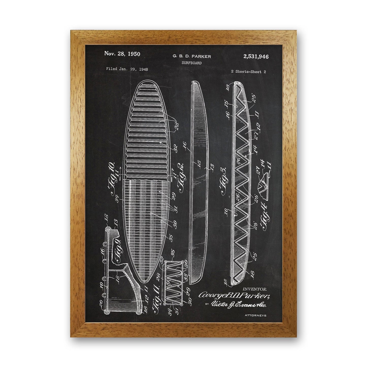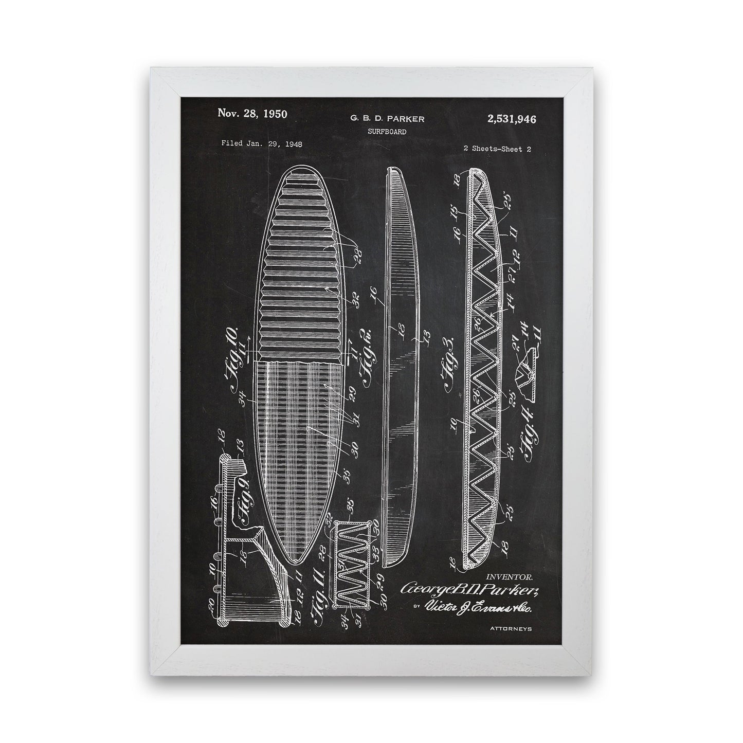 Surfboard Patent original Giclée fine art print. Available both as a framed print, print only or vibrant canvas art. Art print from an original by Jason Stanley ©