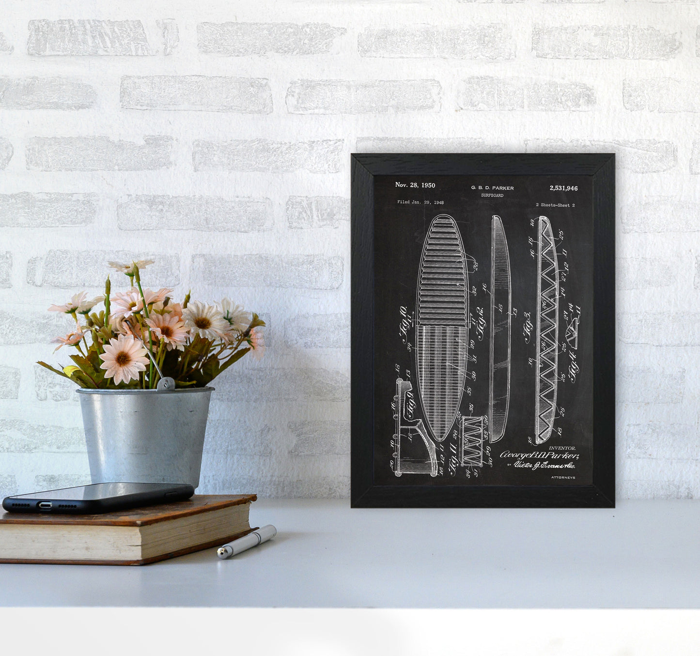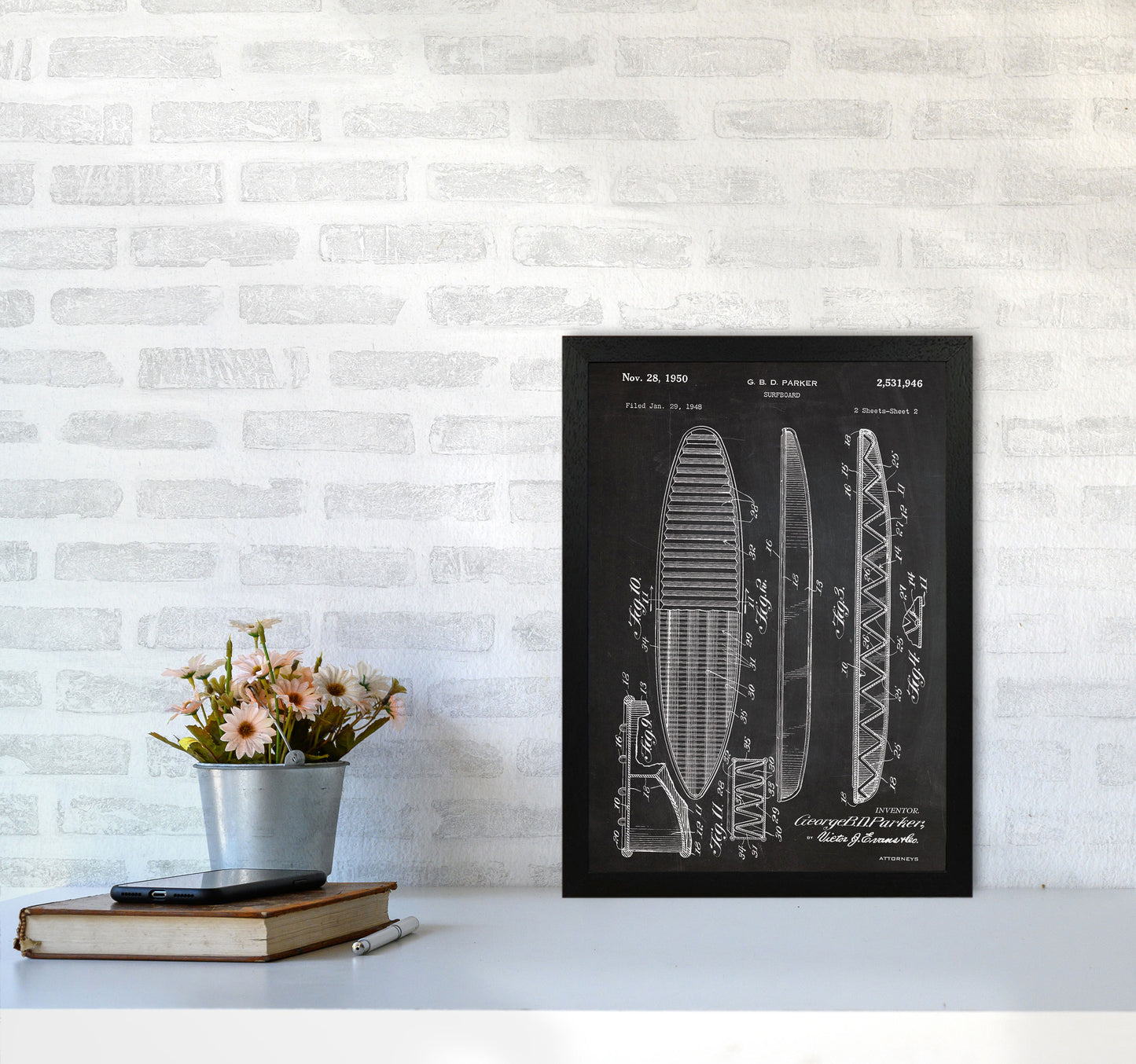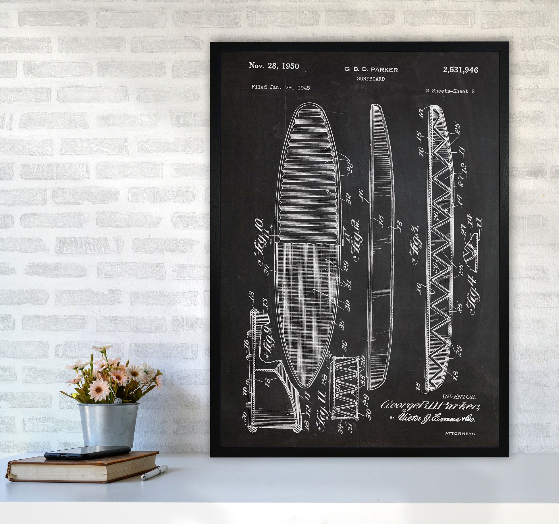 Surfboard Patent original Giclée fine art print. Available both as a framed print, print only or vibrant canvas art. Art print from an original by Jason Stanley ©