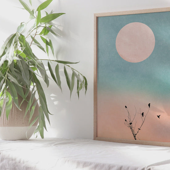 Most customers choose to have their print framed by our in-house team who manufacture all our frames by hand to order. Options of black grain, white grain or honey oak woods are available from sustainable sources. Our framed art is glazed with crystal styrene for safety during transportation and in the home and to ensure longevity. Frames arrive ready to hang on the wall.
